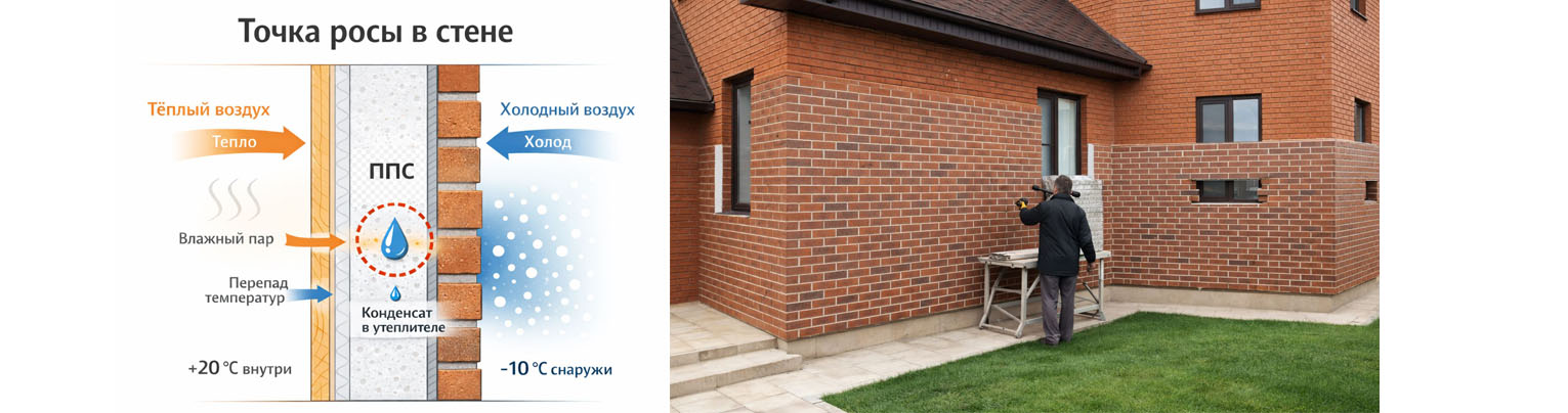 Опасность возникает не из-за самого ППС или клинкерной плитки, а из-за ошибок монтажа: влажного основания, недостаточной толщины утеплителя, подсоса воздуха через щели и неправильных узлов примыканий.