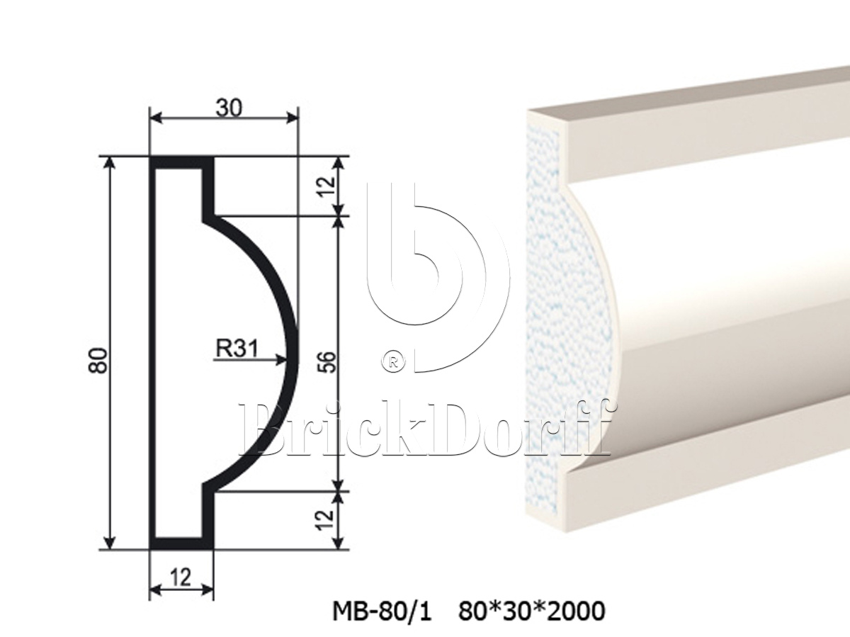 Молдинг для фасада - лепнина, декор из пенополистирола МВ-80/1 (МС-103) 80*30*2000 мм