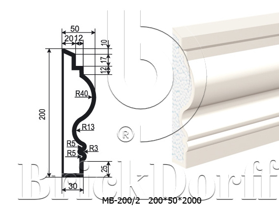 Молдинг для фасада - лепнина, декор из пенополистирола МВ-200/2 200*50*2000 мм