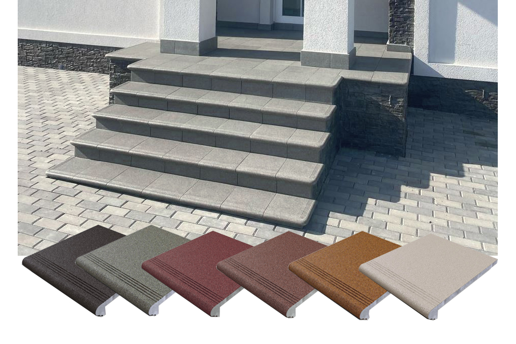 - ⚒ Комплектность системы — фронтальные ступени с капиносом, угловые элементы, подступенки и плитка.